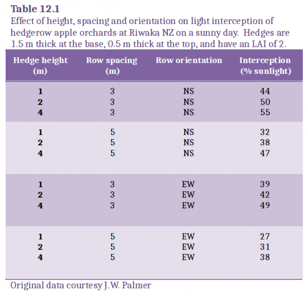 Light interception of horticultural crops can be altered by changing spacing, tree height, tree shape and/or row orientation. An illustration of this is given in Table 12.1 using a simulation model of light interception (Palmer 1989). The model calculated light interception over a whole day and allowed for change in incident radiation, sun angle (both elevation and azimuth) and sky light. The model was used to calculate light interception under sunny conditions by apple trees arranged in continuous rows, of truncated conical cross-section, in midsummer at Riwaka, Nelson, New Zealand. For a constant LAI, light interception increased by increasing hedge height, closer row spacings and planting in a north–south rather than an east–west orientation (Table 12.1). Light interception varied by a factor of two, from 27% by short wide-spaced hedges in east–west (EW) rows to 55% by tall close spacings in north–south (NS) rows. Differences due to row orientation will be smaller in cloudy regions where more of the incoming light is diffuse.
