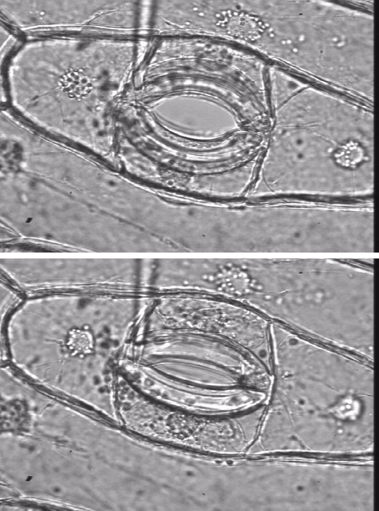 Figure 3.61. Guard cells are structured so that high turgor pressure opens the stomatal pore, and low turgor pressure closes the pore. Left (Lower image), Partially open Tradescantia virginiana stoma with 0.2 MPa guard cell turgor, as measured directly with a guard cell pressure probe (shown). Right (upper image) same stoma showing the aperture almost fully open, with 3.6 MPa guard cell turgor. (Images and data courtesy P. Franks).